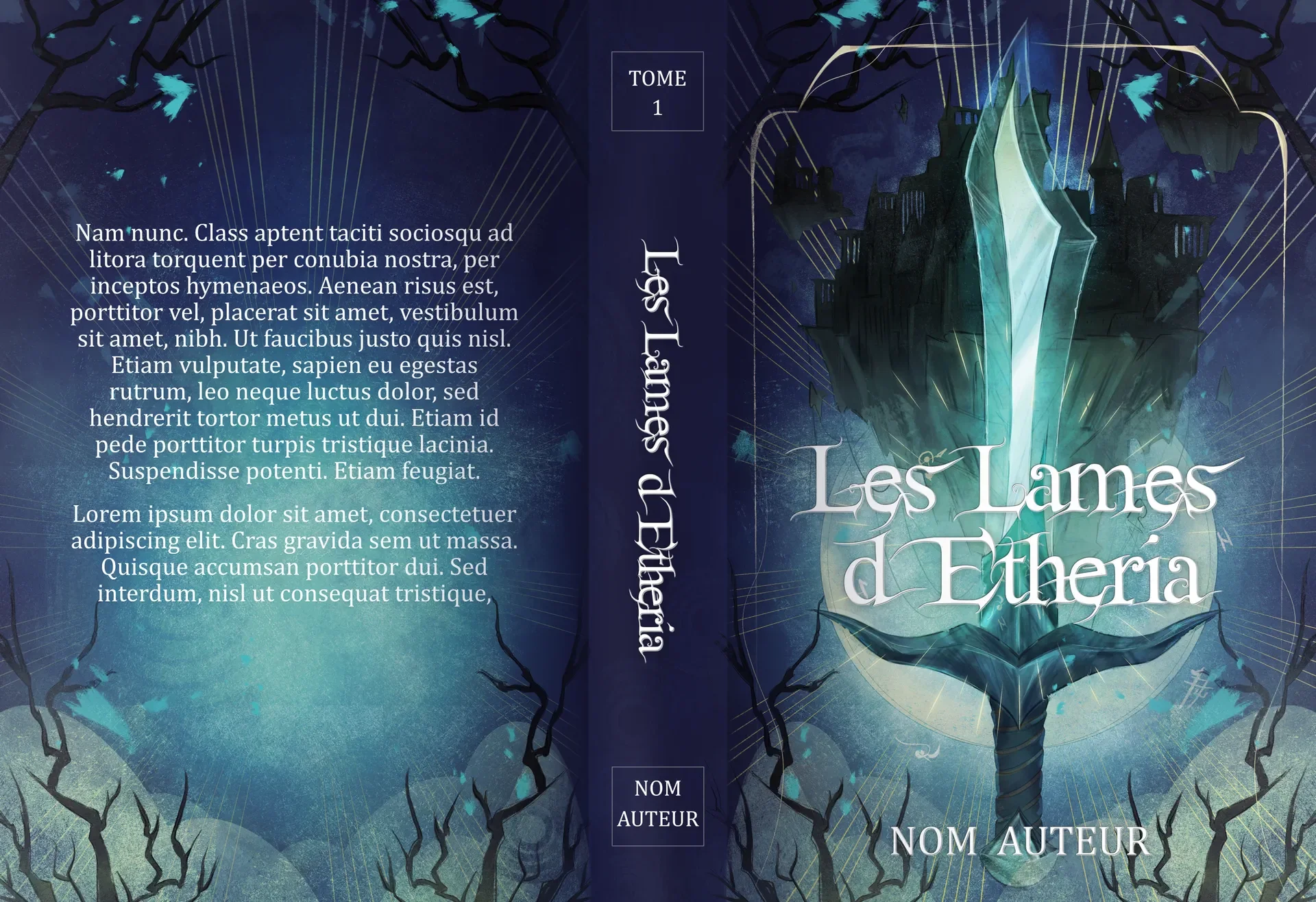 Les Lames d’Etheria est une couverture conçue pour un roman de fantasy young adult mêlant aventure, mystère et magie.